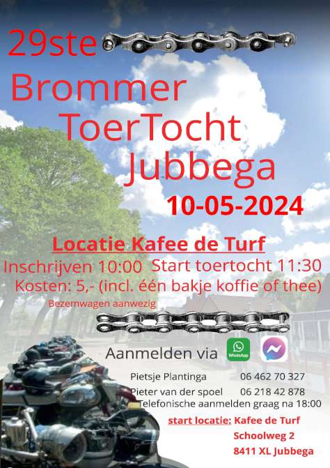 kafee de turf schoolweg 2, Jubbega, NederlandDit jaar is alweer de 29 ste Brommer toertocht te jubbega. Start locatie is bij Kafee de Turf, Schoolstraat 2, 8411 xl Jubbega. Vanaf 10.00 uur is de inschrijving en... Lees verder »